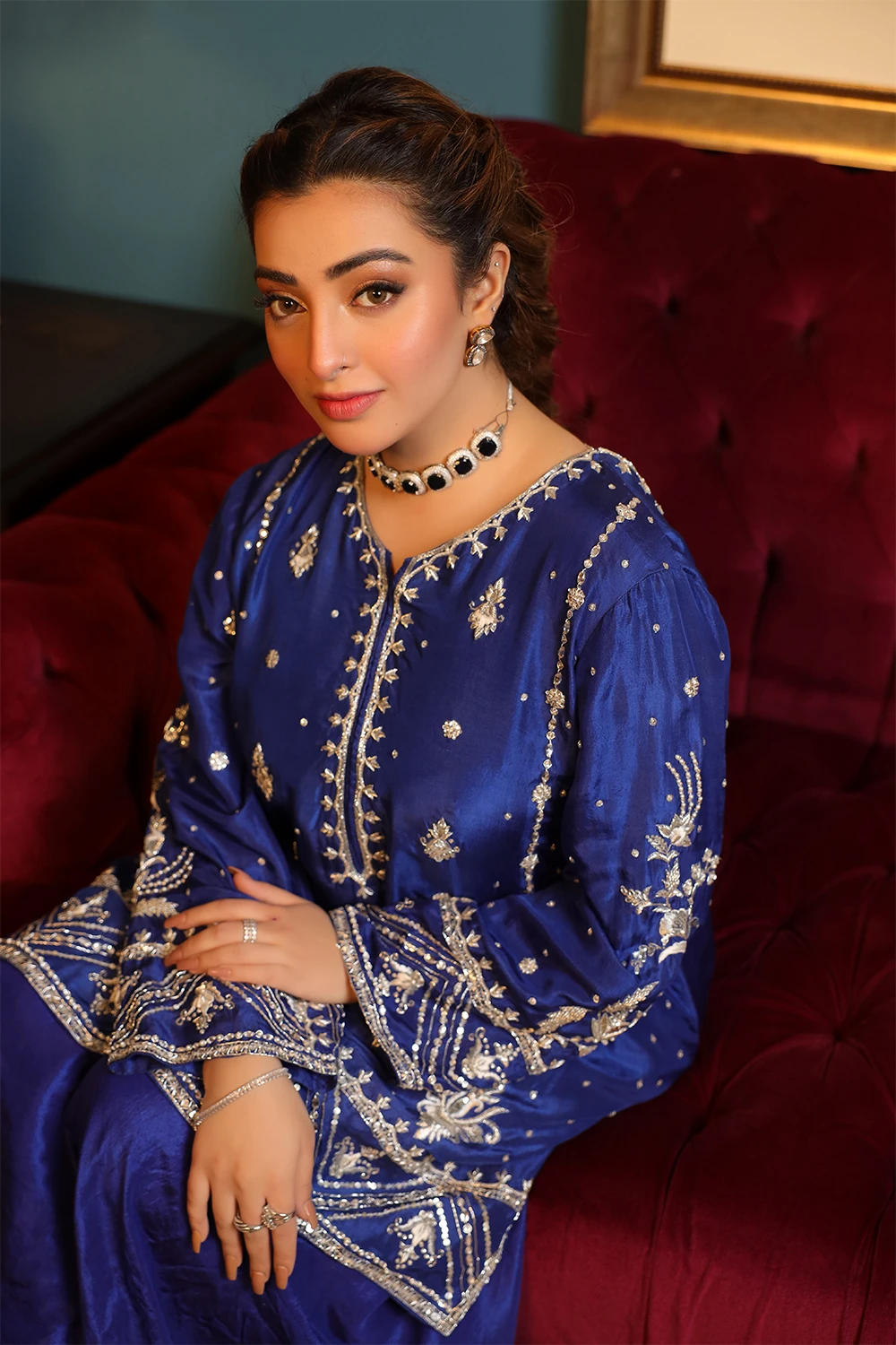 In the regal shade of royal blue, the dress embodies a sense of majesty and charm. Adorned with exquisite silver embroidery and handwork. The shimmering zardozi, dabka, naqshi, stones, cutwork, dana, sequins, rasham, and pearls dance across the fabric, creating a tapestry of luxury.