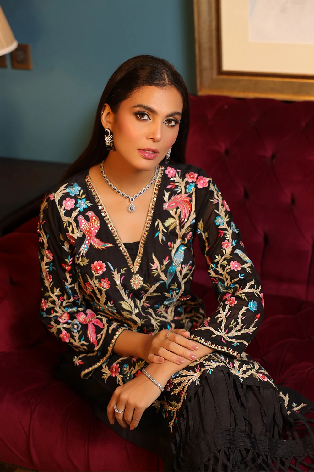 Introducing our luxurious hand-crafted Elegance -Nura, made from the finest Korean raw silk. The front side features a rich palette of thread colors with heavily embellished handwork focusing on smokey gold, pink, and blue, creating a captivating visual. The V-shaped neckline adds an appealing look, highlighting the wearer’s natural beauty.