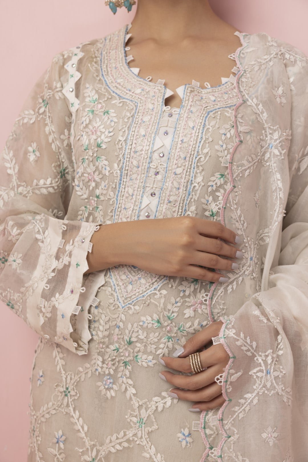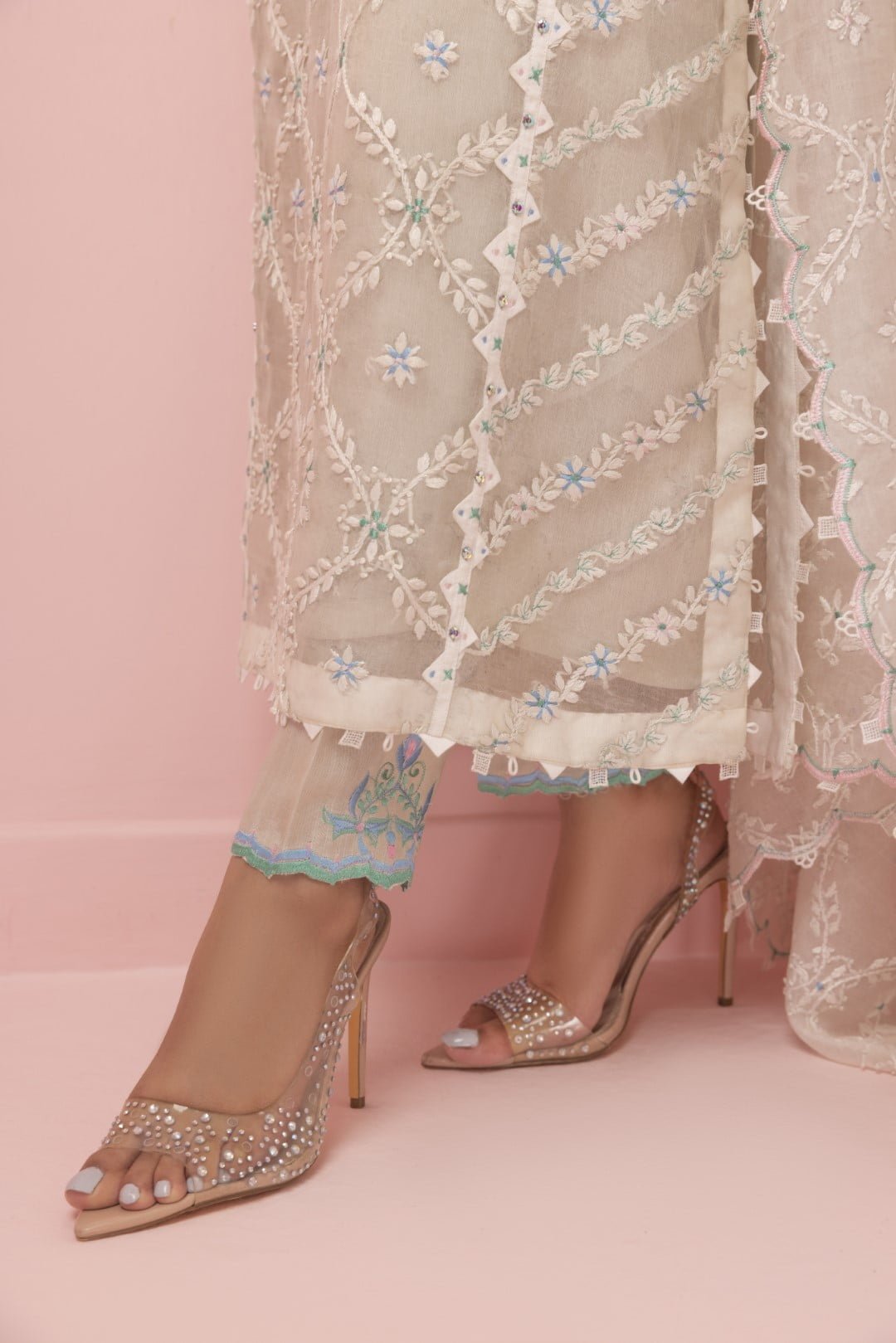 Presenting the breathtaking Filza ensemble. A true testament to elegance and intricate craftsmanship. This ravishing outfit features a full-length shirt made from cross stitch pure Organza, adorned with delicate floral embroidery in pastel shades of pink, lime, and gray. The neckline is a focal point, richly embroidered and accented with fabric loops and pearls. This whole detail creates a captivating and sophisticated look. The sleeves are equally enchanting, showcasing heavy embroidery, dori work and edges adorned with fabric loops and pearls, adding a touch of refinement.