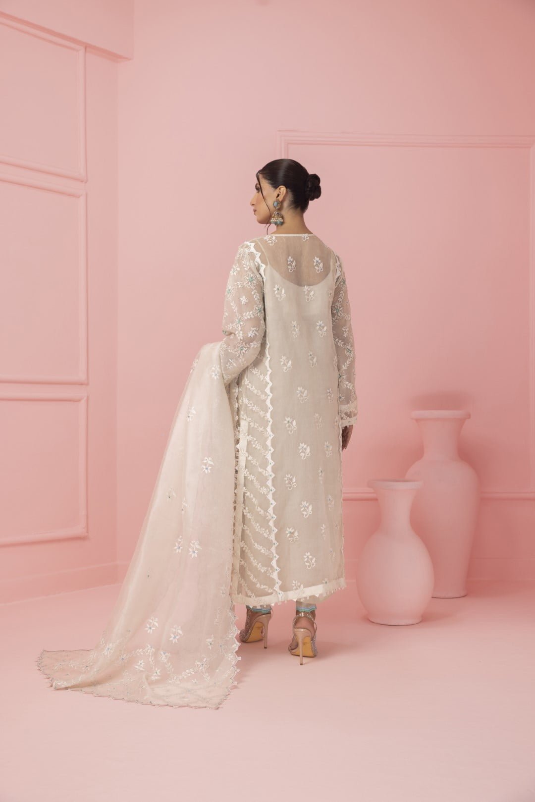 Completing the ensemble is the dupatta, also made from cross stitch pure Organza. It is beautifully embroidered, reflecting the same attention to detail found throughout the dress. The final touch of the dupatta includes fabric loops and hanging pearls, adding a perfect blend of elegance and charm.