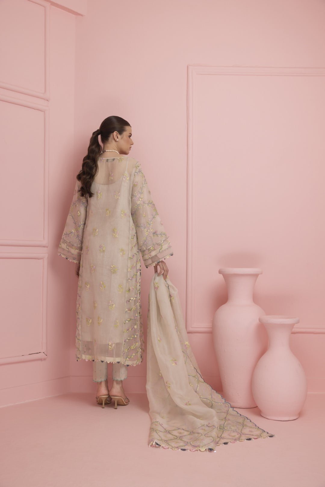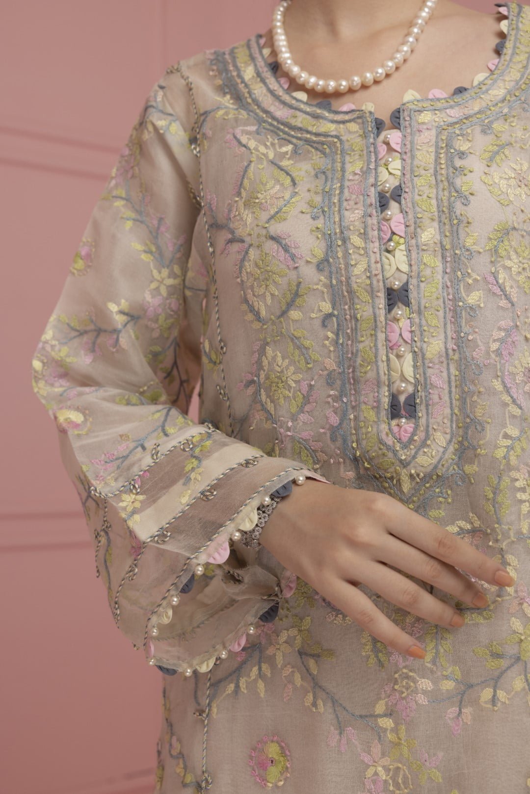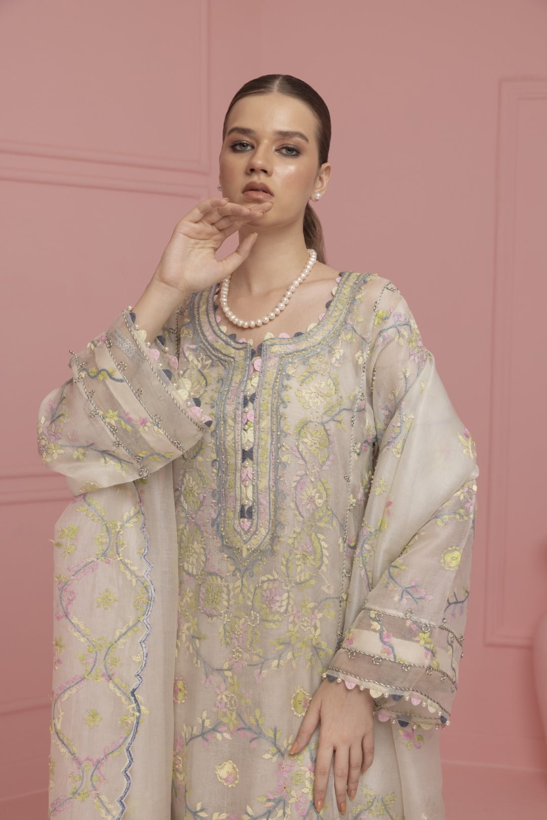 Introducing the exquisite Mahek. The gorgeous dress is draped in soft hues of serene pastel color. This stunning dress features a full-length shirt crafted from cross stitch pure Organza, exuding a delicate charm. The shirt is adorned with intricate embroidery, highlighted by a heavily embellished neckline with sparkling stones, detailed triangle work and loop accents. The sleeves and shirt border mirror these meticulous details, enhancing the overall allure. Beneath the shirt, the raw silk slip ensures comfort and a seamless silhouette, providing a perfect foundation for the outer layer.