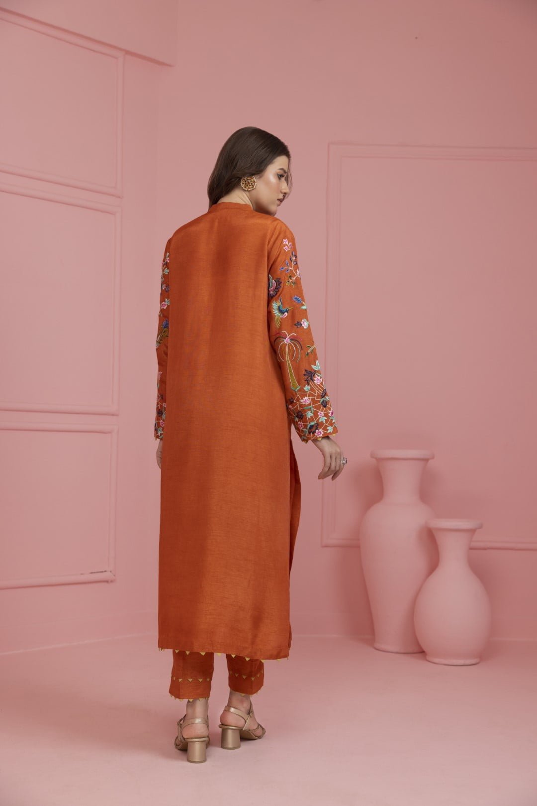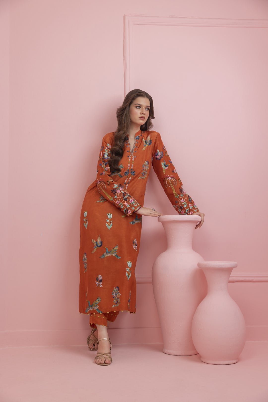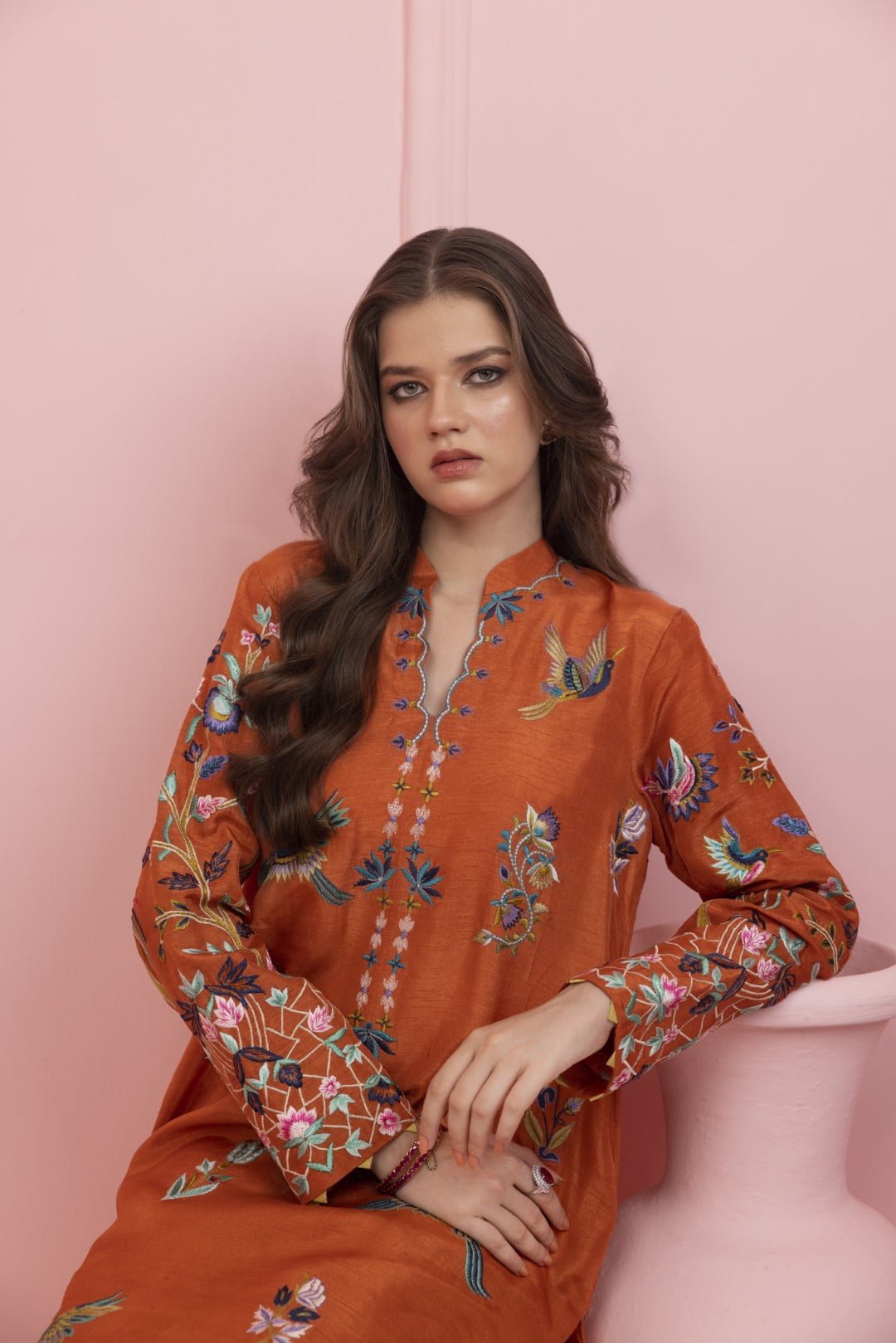 Draped in a mesmerizing orange color “Miza” a captivating ensemble that blends traditional artistry with modern elegance. crafted from premium Korean raw silk, ensuring a luxurious feel. The long shirt is a masterpiece, adorned with intricate embroidered bird motifs that celebrate nature’s beauty. The neckline features special detailed embroidery, adding an exquisite touch that enhances the overall allure. The sleeves are fully decorated with delicate floral embroidery, and both the sleeves and the shirt’s daman are accented with charming mini triangle patterns.