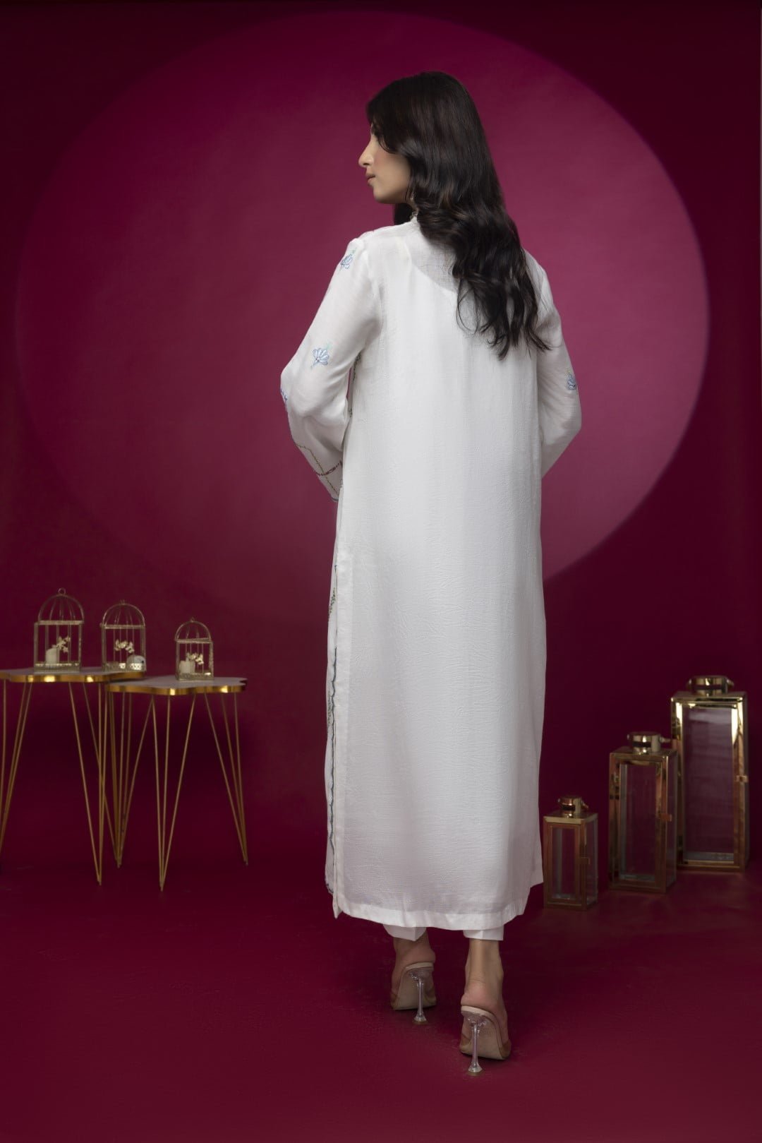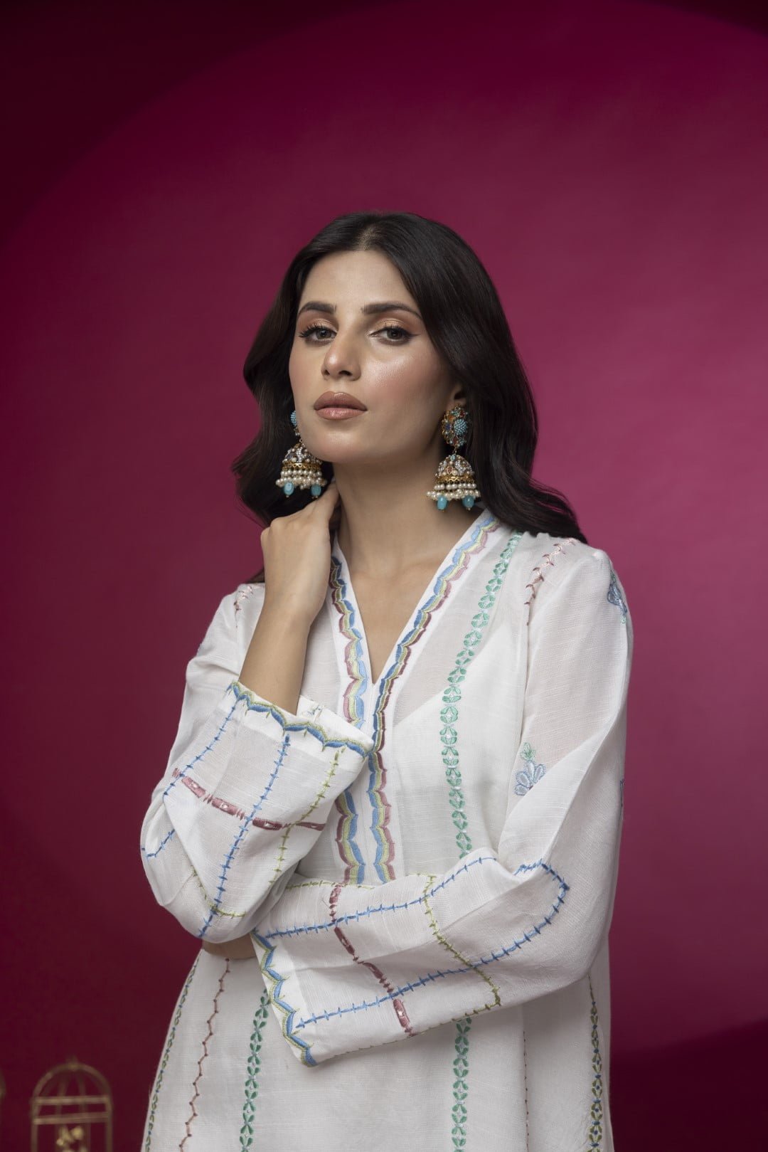 Introducing Sahar, a stunning white dress that celebrates elegance and sophistication. Sahar is crafted from the finest raw silk. This all-white ensemble is designed with simplicity. The long shirt features intricate machine embroidery throughout of beautiful colors, showcasing the craftsmanship and attention to detail. The V-shaped neckline is beautifully embroidered, adding a refined touch to the overall design.