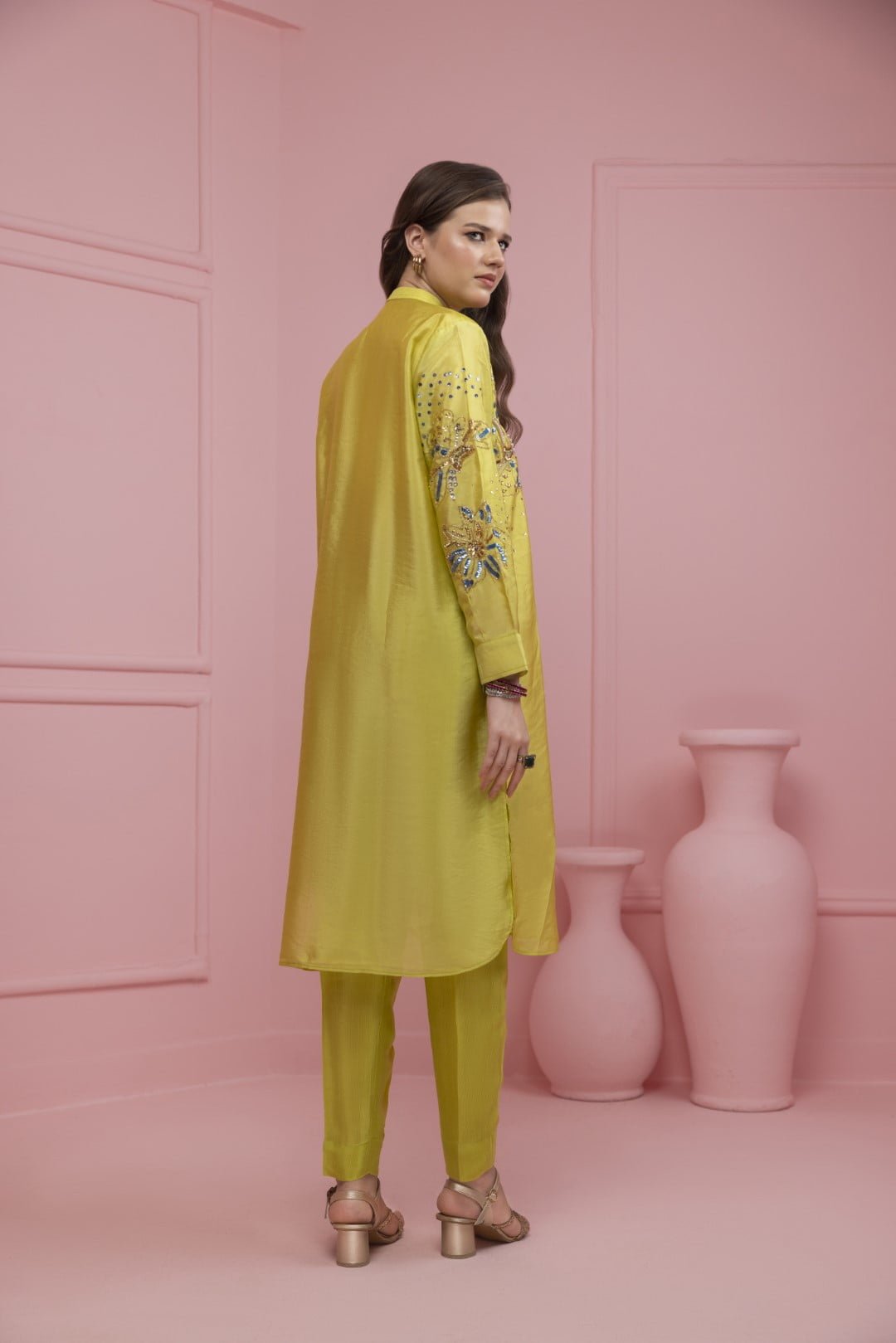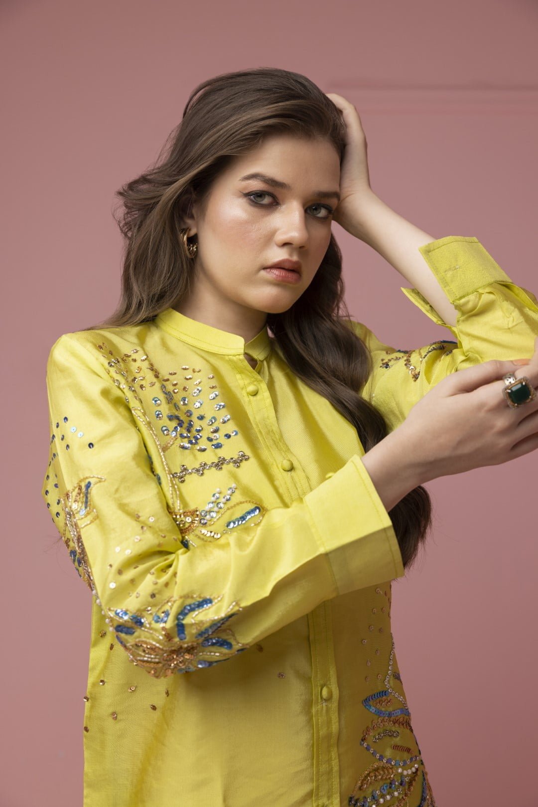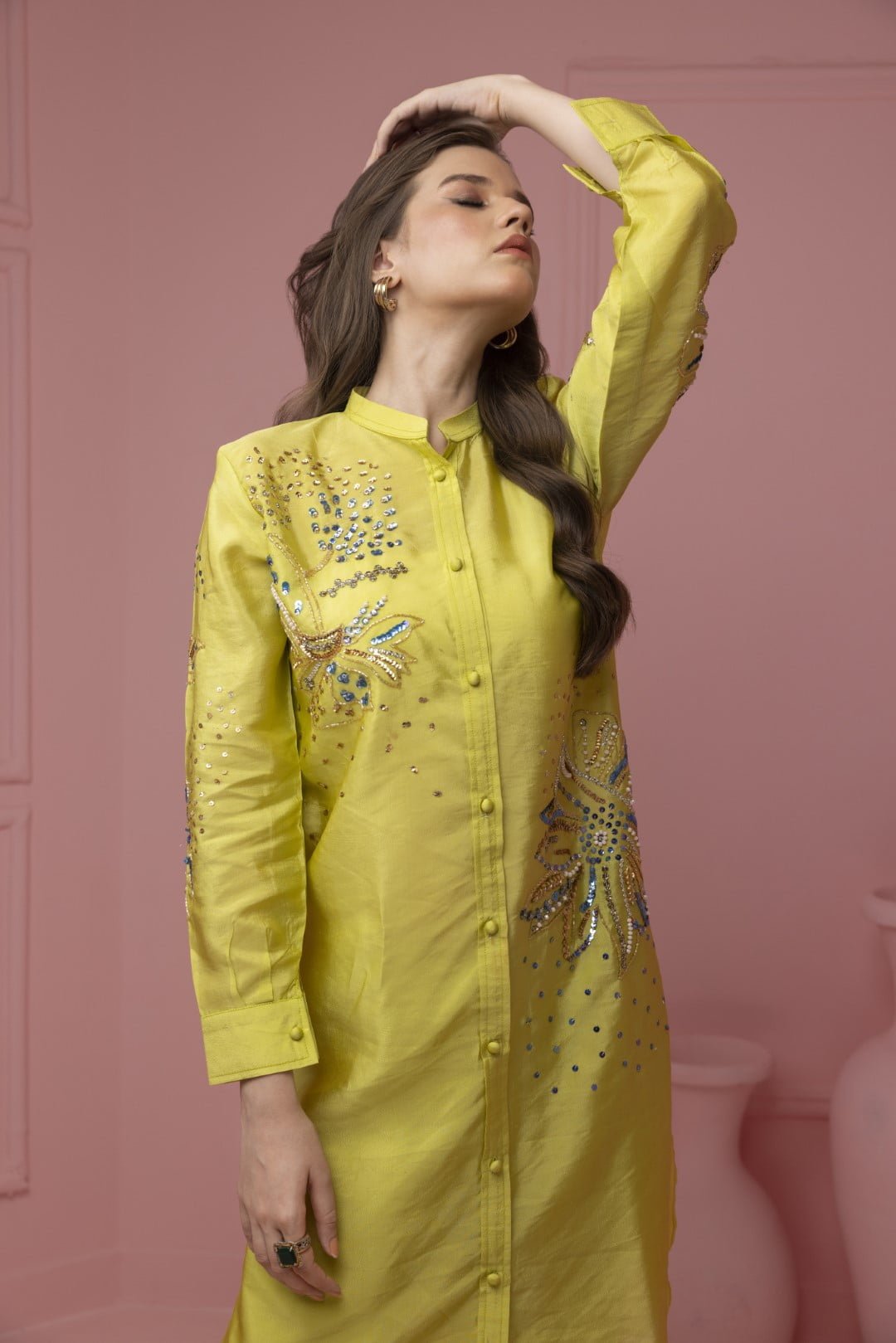 Embellish your style with the radiant charm of “Zuri”, a neon-colored masterpiece that exudes grace and sophistication. Crafted from luxurious buttersilk fabric, the long shirt is adorned with exquisite stonework, creating a stunning floral statement on the front panels. The button-down design adds a touch of modern elegance, while the detailed stone embellishments on the sleeves enhance its opulence.