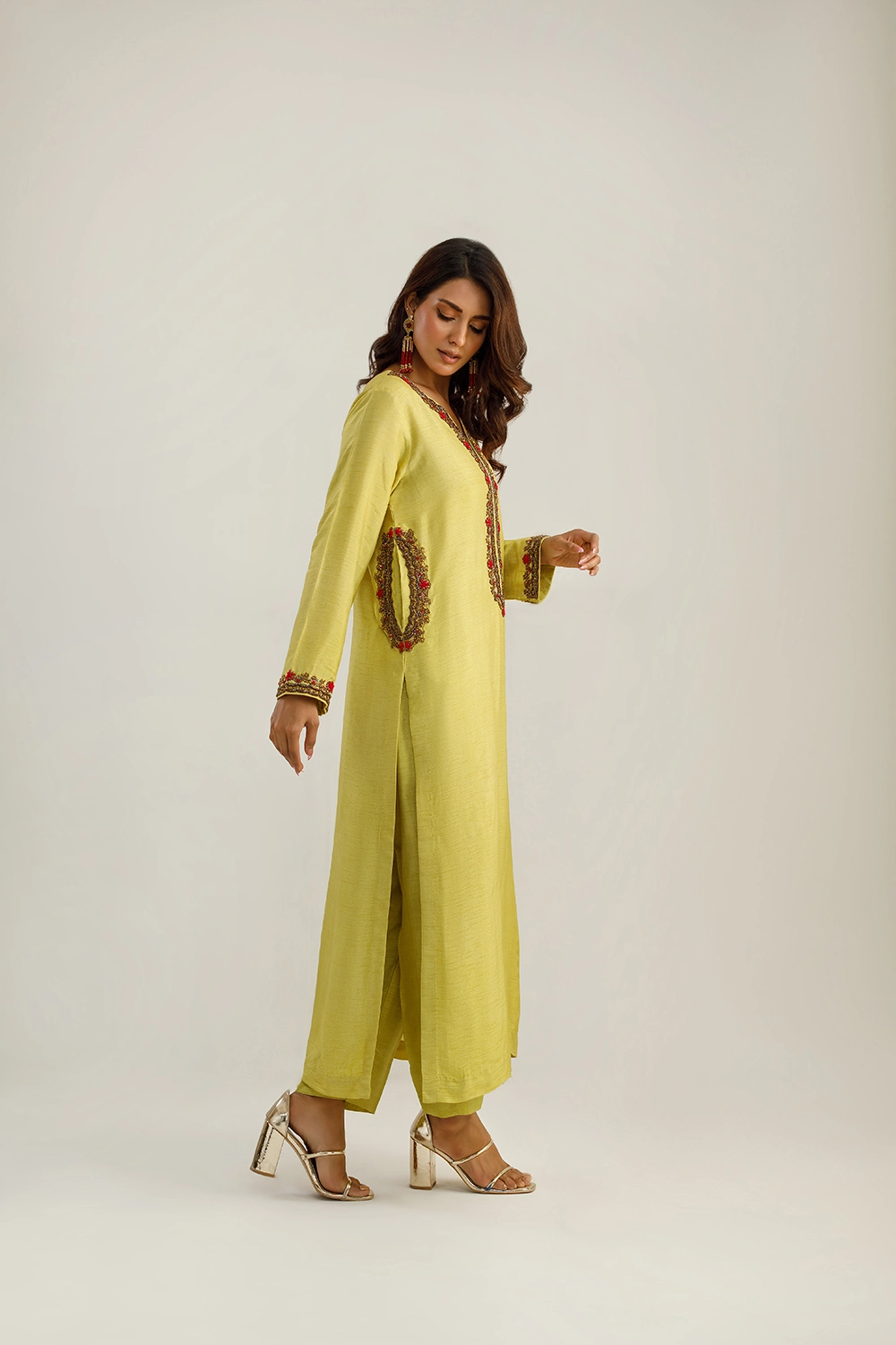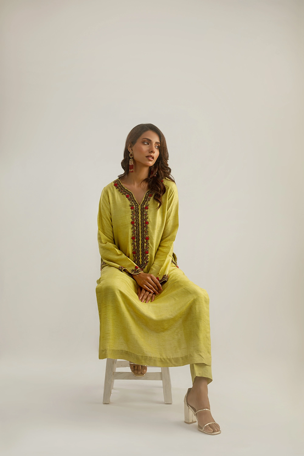 Introducing “Alara,” a creation where sophistication meets artisanal craftsmanship. This ensemble, meticulously tailored from the finest Pakistani raw silk, is presented in a captivating olive tone, signifying a blend of luxury and elegance.