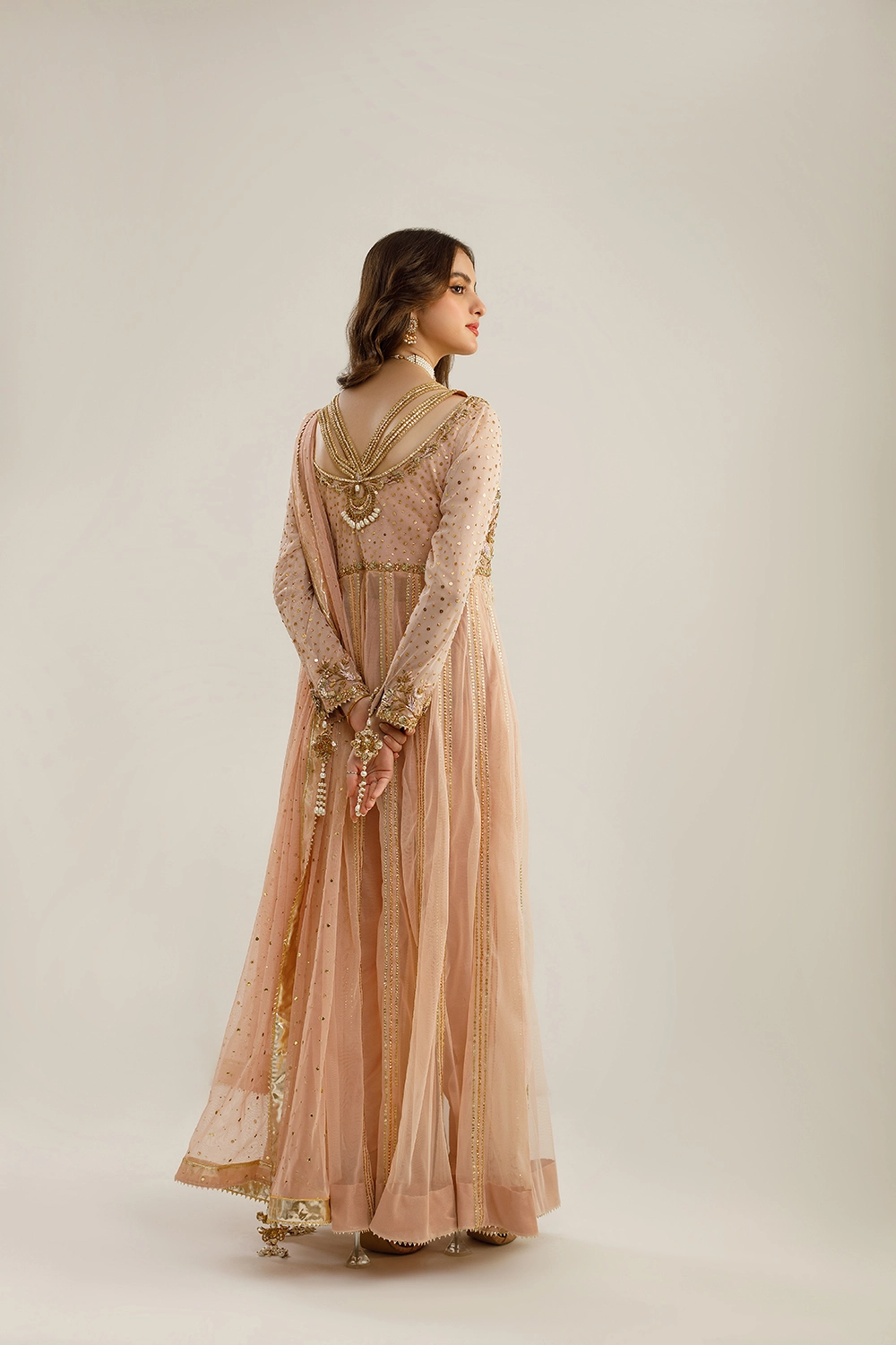 The sleeves and dupatta of “Iman” are adorned with tassels featuring delicate pearls, adding a touch of playfulness and sophistication to the ensemble. The open-back neck design, crisscrossed with tassels and hand-embroidered with pearls, adds an element of surprise and elegance.