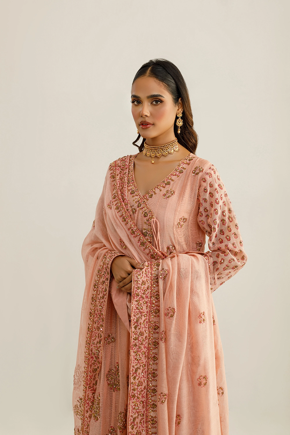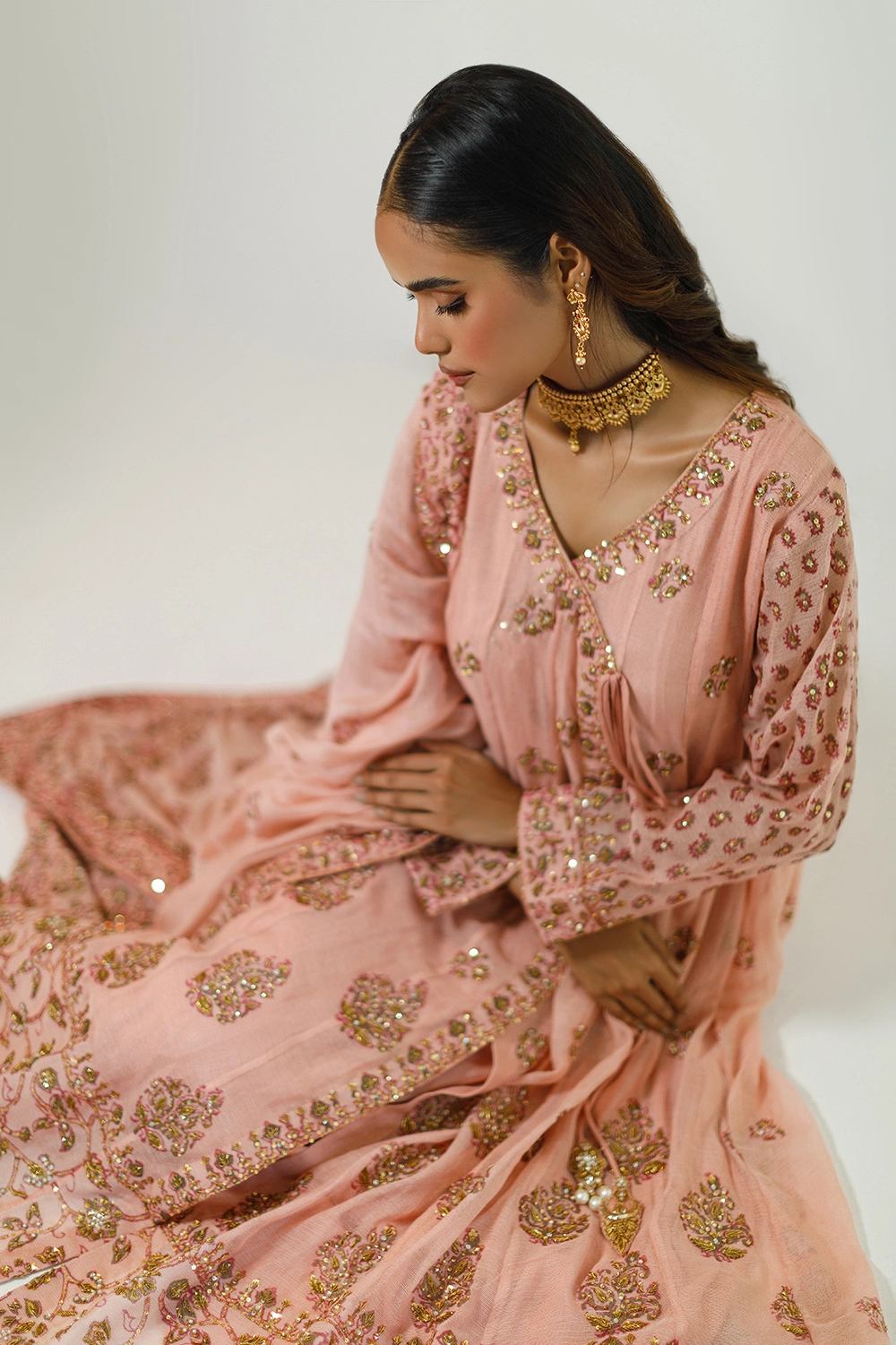 The dress’s fabric, a sumptuous cotton net in tea pink, provides a vivid canvas for the embellishments. The Angrakha front, a traditional design element, is reimagined with signature tassels hanging down, adding movement and grace. Accompanying the dress is the equally ornate dupatta, crafted from the same cotton net, adorned with similar embroidery and enhanced with tassels, echoing the elegance of the dress.