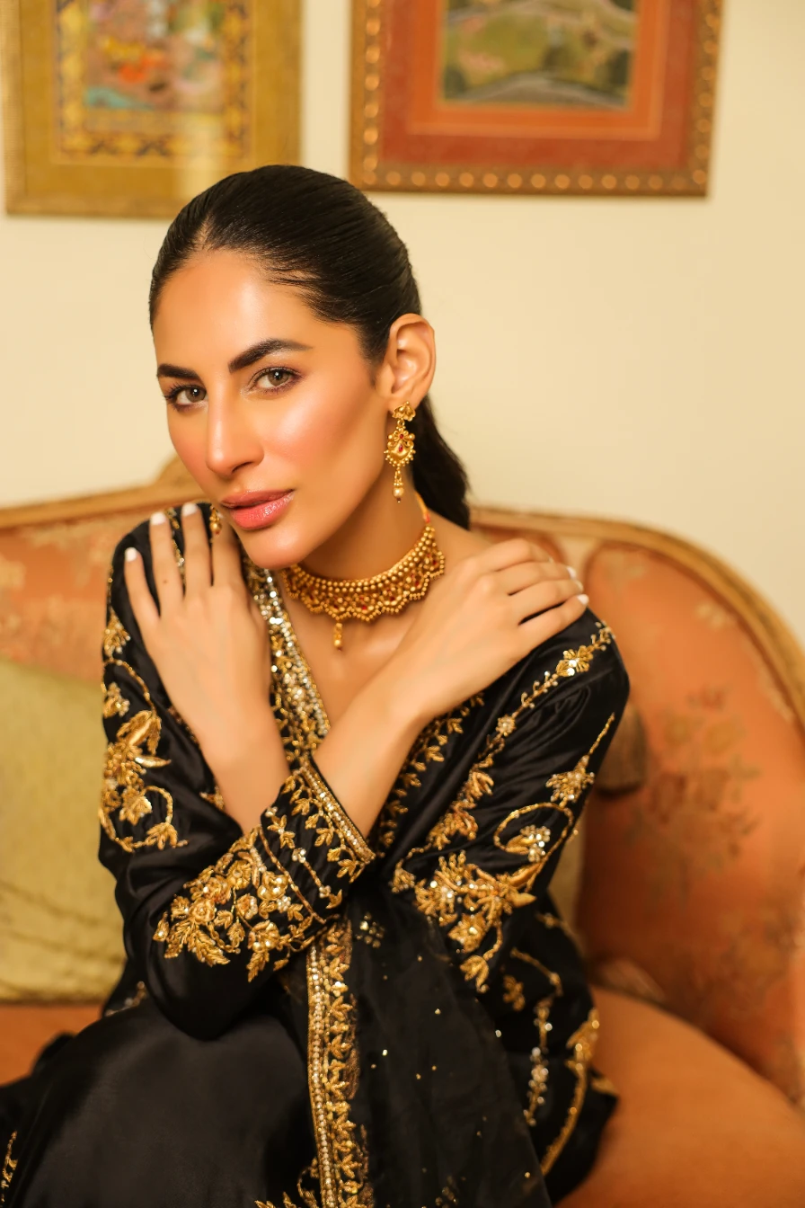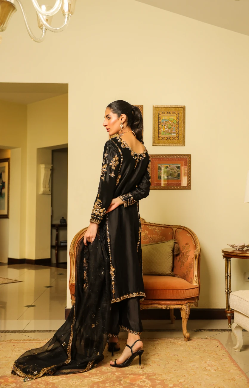 Introducing the “NISA” Black Dress with Gold Work, a picture of elegance and charm. This gorgeous outfit features intricate gold hand embroidery with Dapka, Nakshi, Resham, Sequence, and crystal accents. The dress is elevated with sumptuous embroidery on the sleeves and handmade tassels and emerald crystals on the neckline. The dupatta showcases gold accents, clusters of golden mukesh, and handcrafted tassels for a modern touch. The culottes-style trousers add a line of golden embroidery, enhancing the dress’s appeal. Made from Shesha silk and Organza, the “NISA” dress exudes refinement and grace for your special occasions.