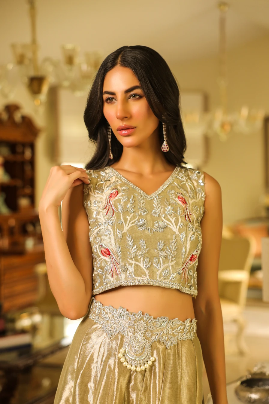Presenting “SHAHNOOR” Golden Lehnga Choli, an exquisite masterpiece exuding opulence and elegance. Crafted with meticulous attention to detail, this ensemble steals the spotlight. The fully flared Lehnga showcases a breathtaking display of Nakshi, Dapka, stones, and Katdana, while a handcrafted waist belt adorned with sparkling tassels adds allure. The Dupatta captivates with meticulous four-sided embroidery, delicate tassels, pearls, and a shimmering scalped design. The Chooli is a statement piece, featuring intricate bird designs, signature tassels, and hand-embroidered details. Crafted from pure lama tissue, the Chooli offers luxurious comfort, while the Dupatta boasts organza elegance and the Lehnga exudes regal presence. Experience the beauty and allure of “SHAHNOOR” Golden Lehnga Chooli, a masterpiece of luxury, style, and fine craftsmanship.