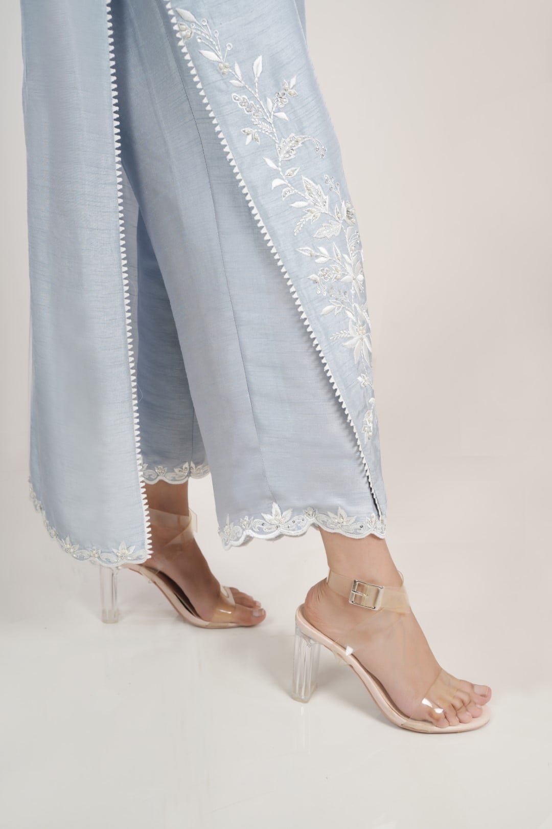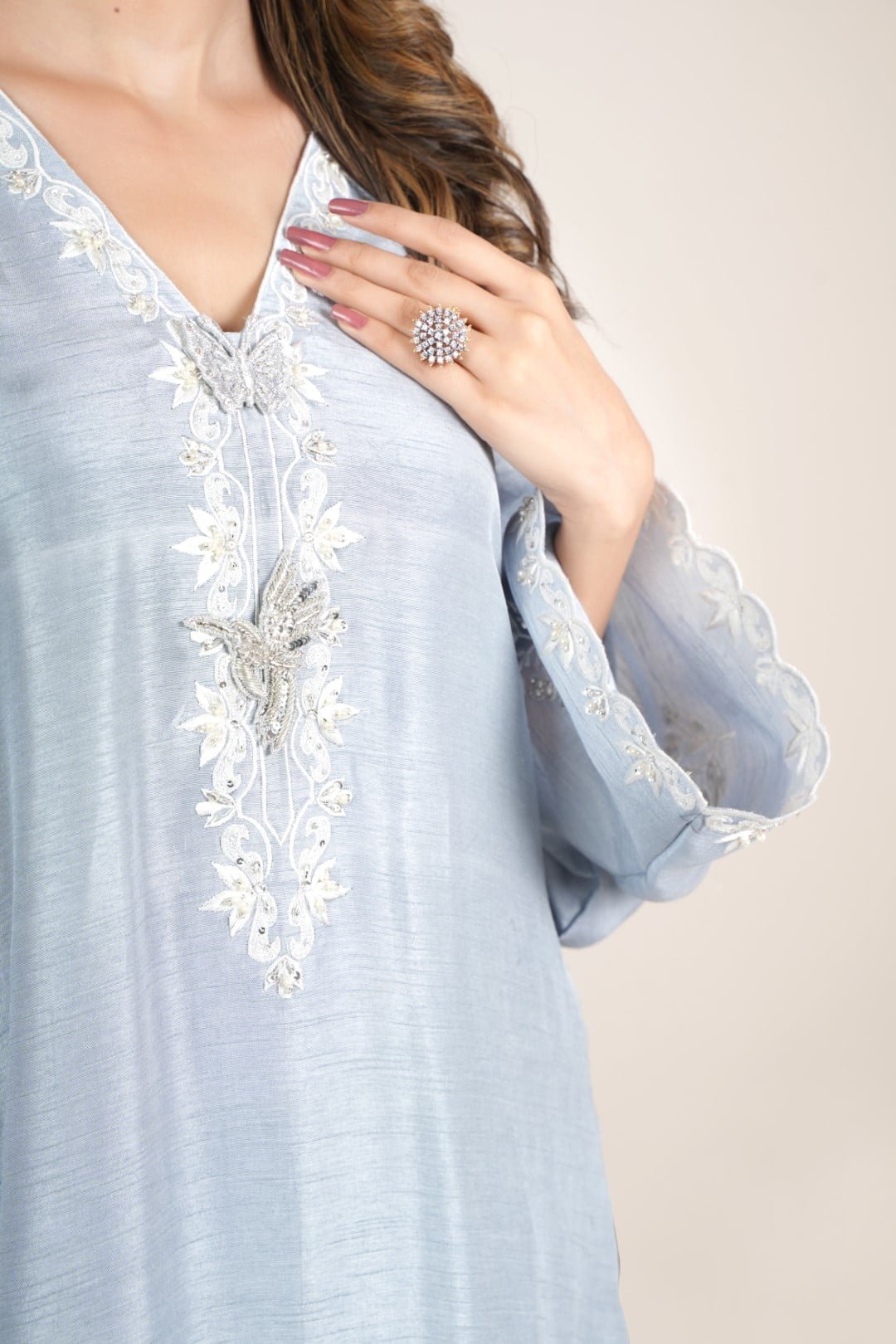Embrace the timeless elegance of “Awinah,” delicately crafted in a captivating powder blue hue. The luxurious Korean raw silk shirt exudes an aura of grace, adorned with mesmerizing Off-white hand Embroidery on sleeves, neckline, daman and back with Rasham, Sequence-cut Dana Stones and Silver embellishments. The butterfly and Bird handmade motifs on the neckline make Awinah epitomize timeless allure. The dress is paired with raw silk trousers featuring delicate off-white embroidery at the edges.
