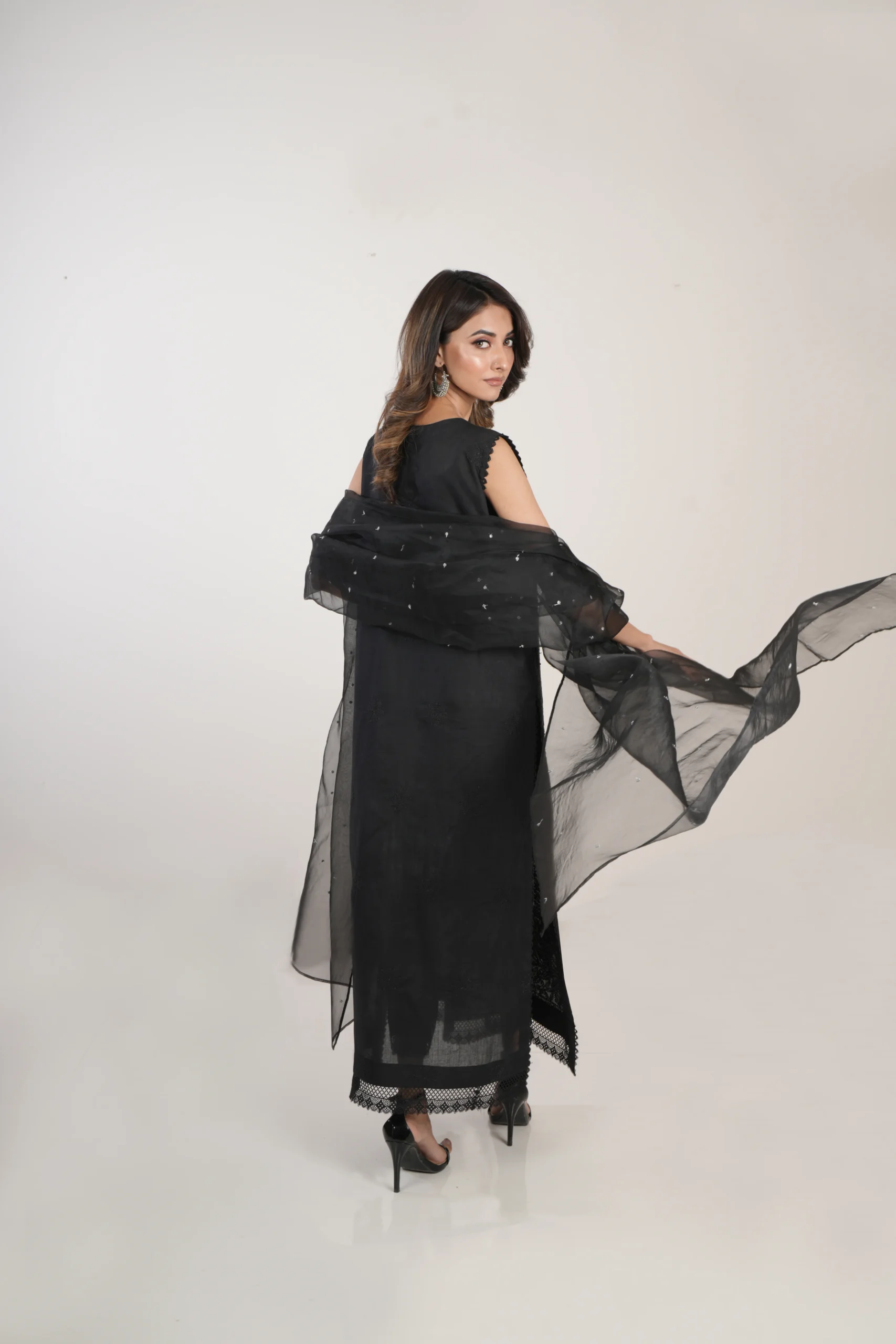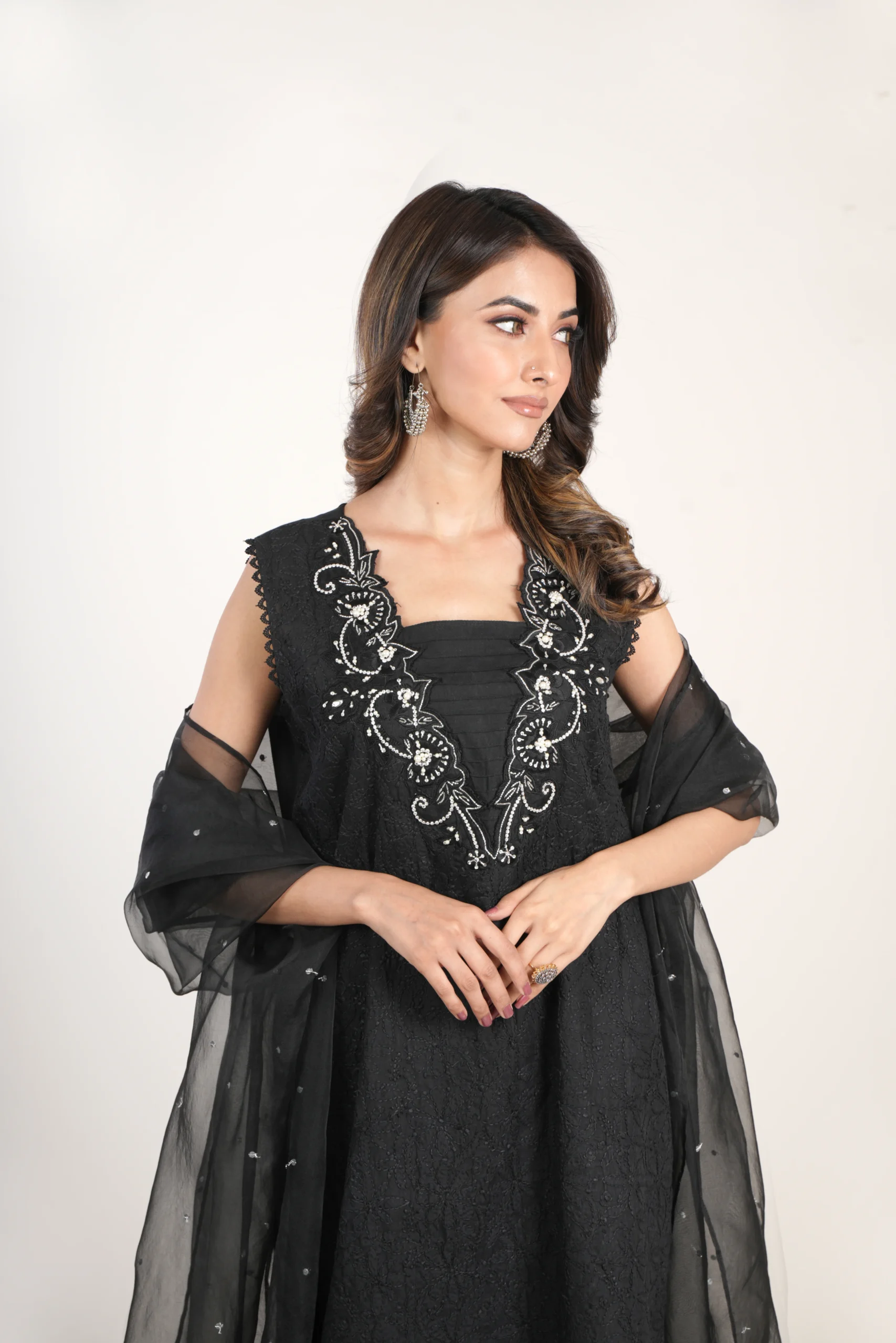 Introducing “LUNA,” a timeless masterpiece in elegant black, inspired by the captivating allure of the moon. Crafted from luxurious cotton, this enchanting ensemble features a full chicken kaari embroidered long-length shirt. The neckline is adorned with meticulous handmade detailing of cut Dana, Sequins, Stones, and Pearls, forming a graceful V-shape that exudes sophistication. With its sleeveless design and subtle lacework on the shoulders, Luna becomes the perfect choice for summer outings.
