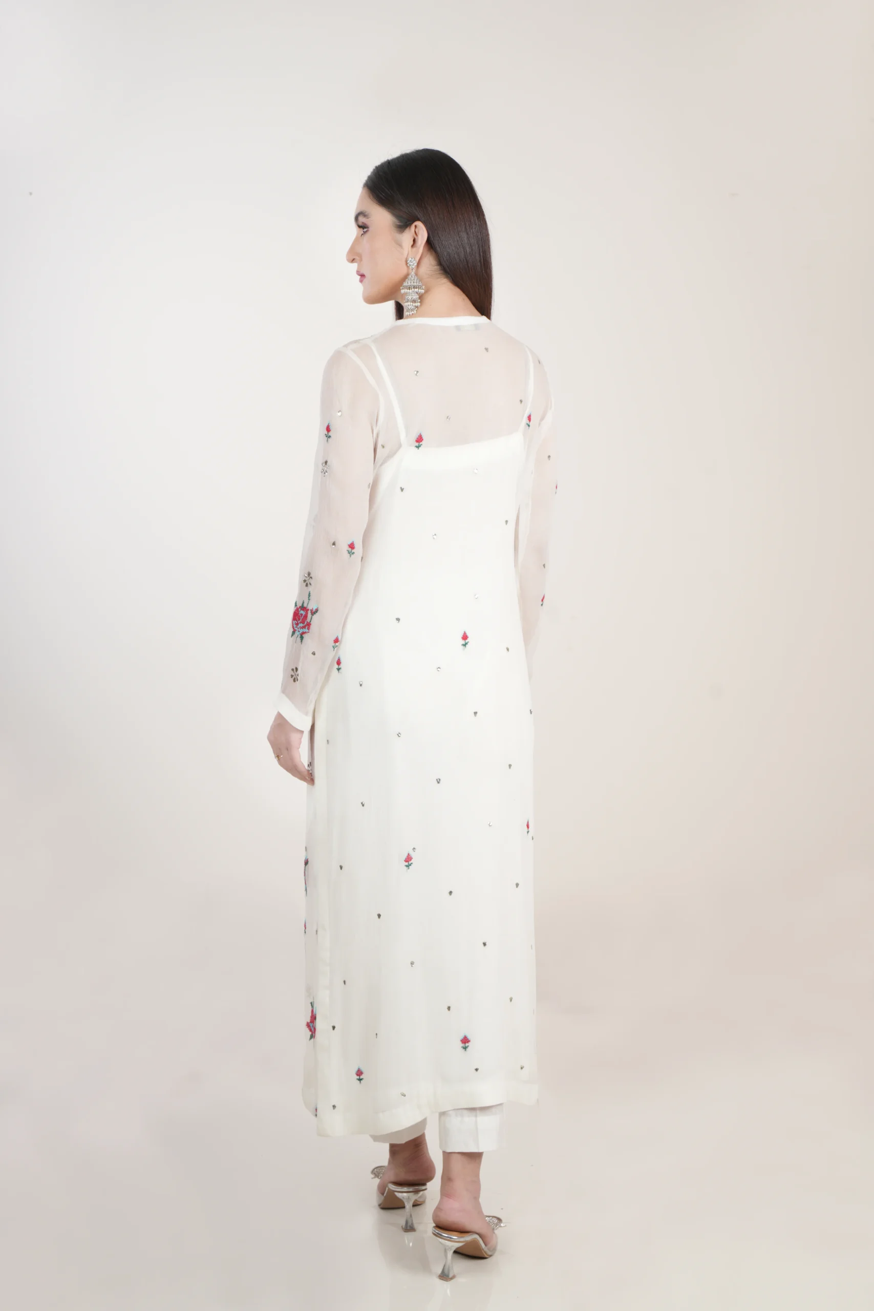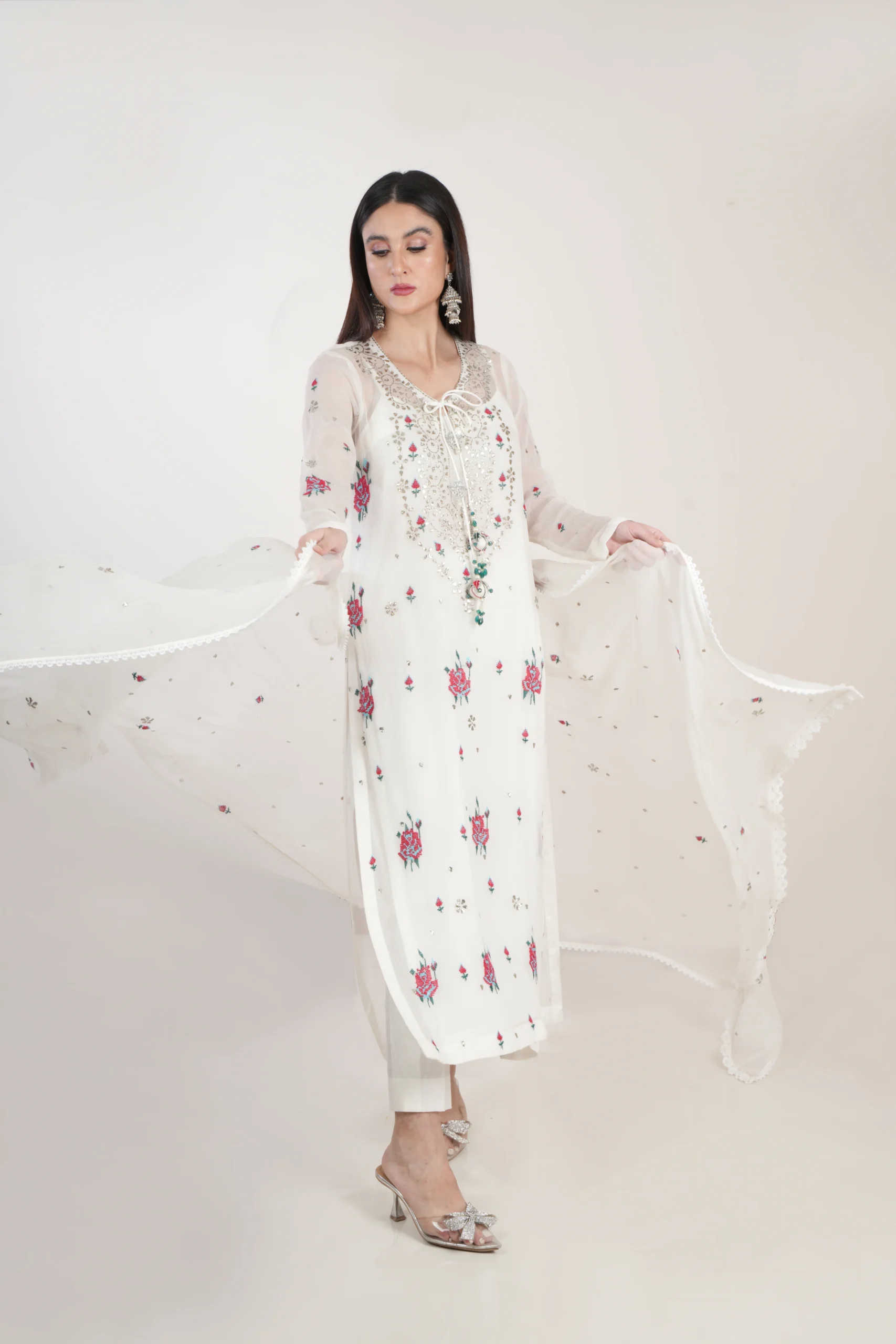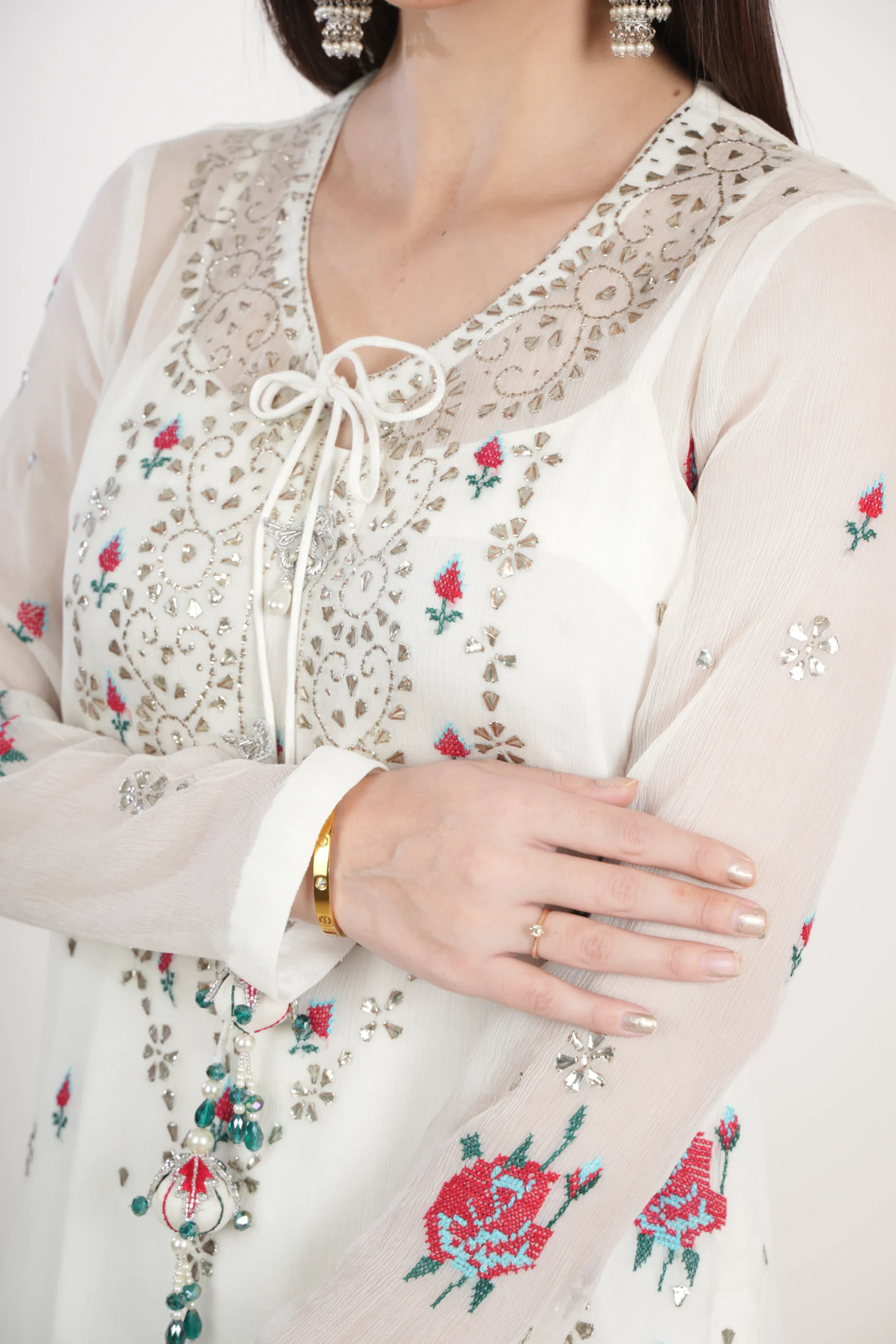 Look classy and elegant in our statement outfit “Zumra”, radiating elegance in pristine white. This exquisite three-piece ensemble features a shirt crafted from delicate chiffon, adorned with intricate cross-stitch work and silver mukaish detailing. The detailed handmade work on the shirt is enriched with tradition showcasing flower bunches in shade of green and red. Additionally, the subtle front detailing is enhanced by handmade emerald green tassel, hanging on the neckline along with silver kaam-dani.