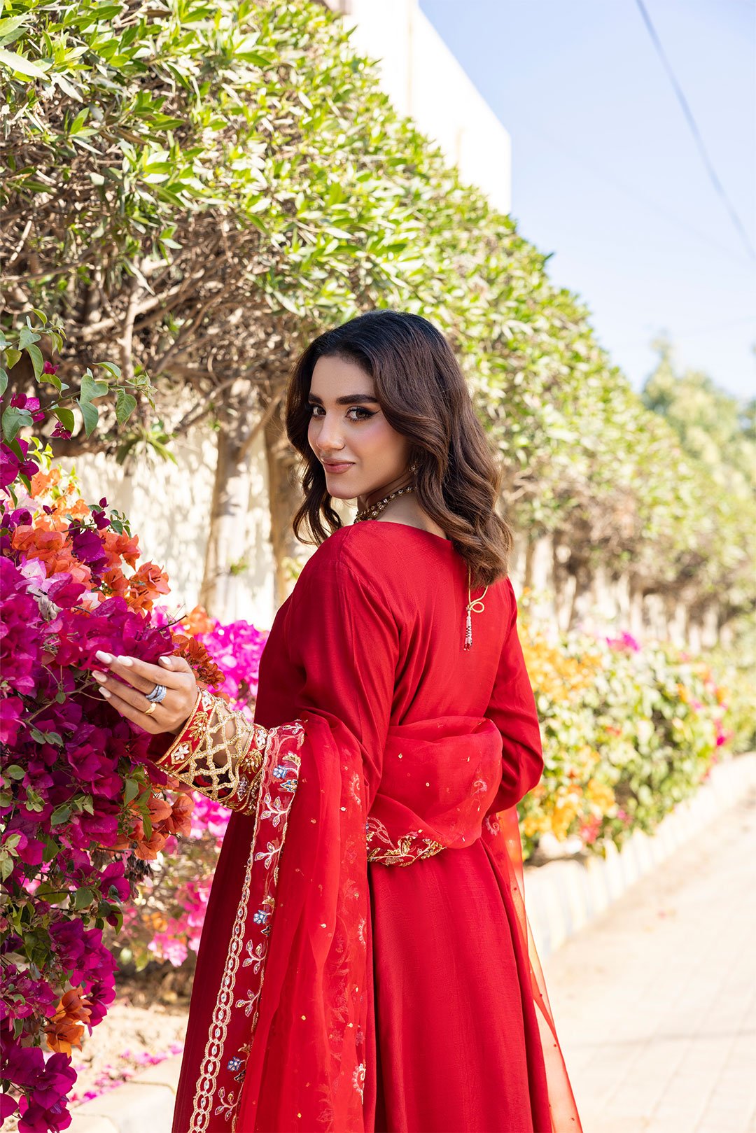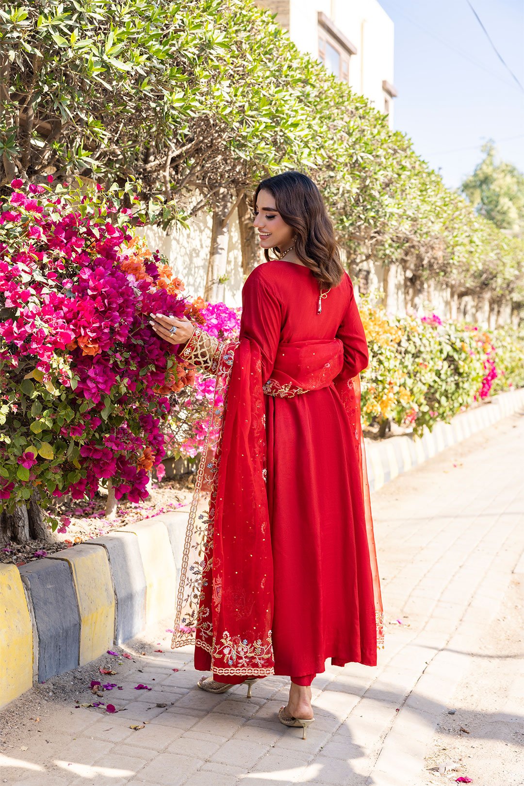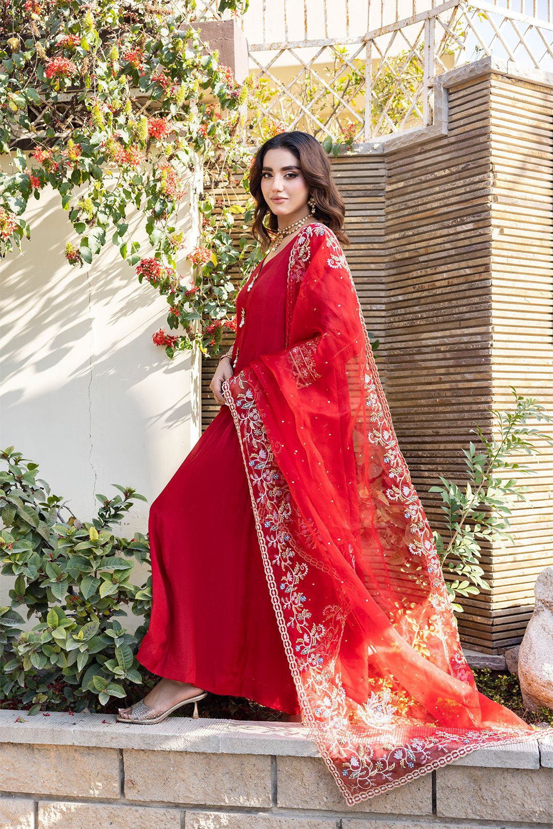 A pure color of femininity, a bold reflection of personality—this Blood Red kalidaar front-open, full-flared ensemble is a masterpiece of strength and craftsmanship. Designed in matte raw silk fabric, it flows with regal elegance. Handcrafted buttons with hanging pearl details grace the neckline, while gold sequins, intricate cutwork, dapka, naqshi, and cutdana elevate the sleeves with artisanal finesse.