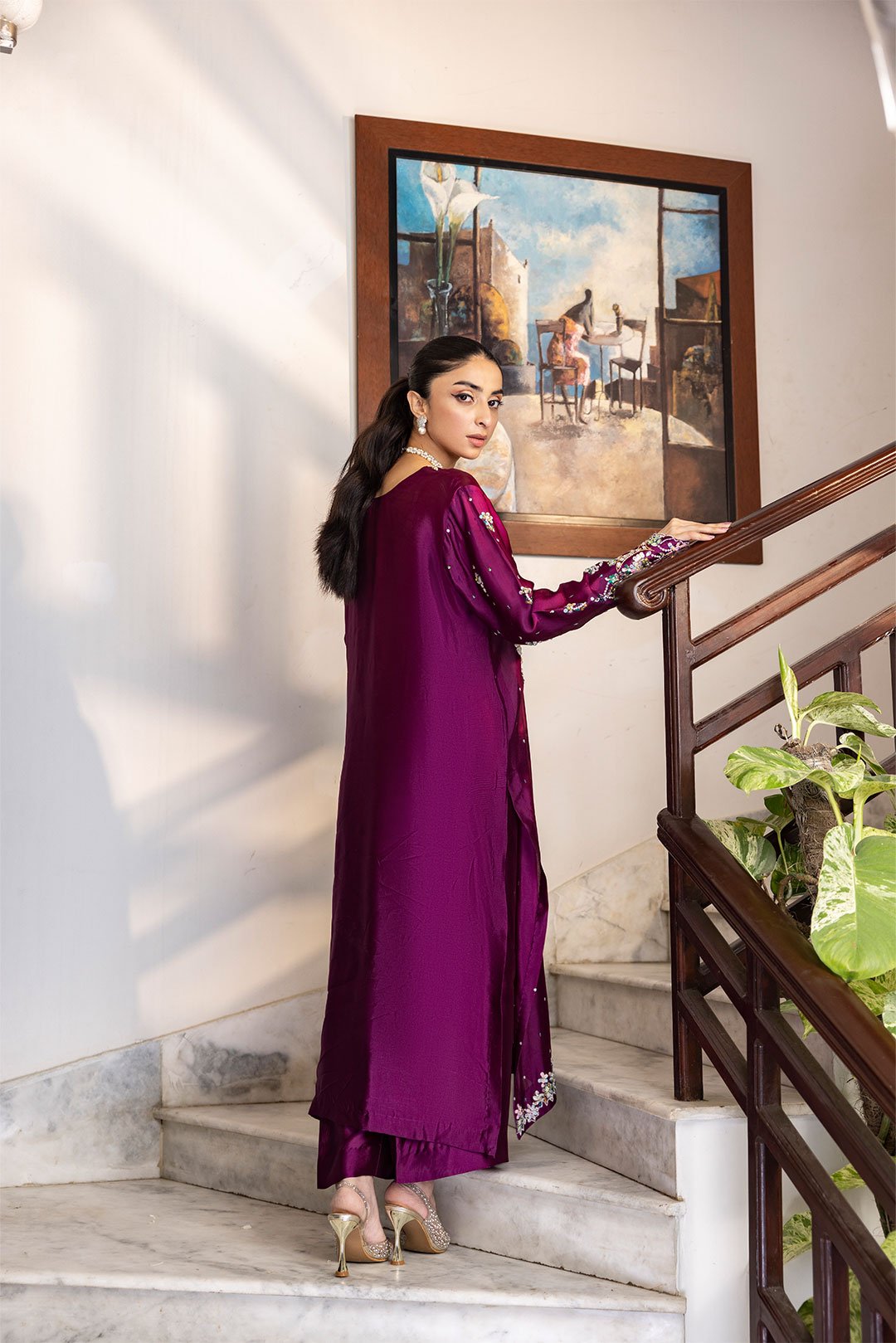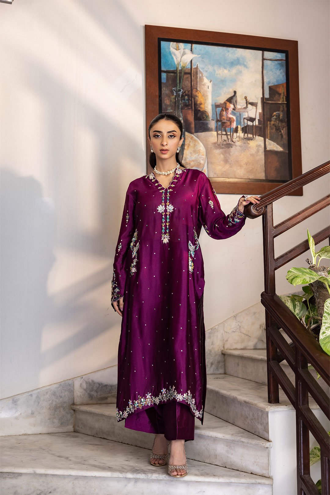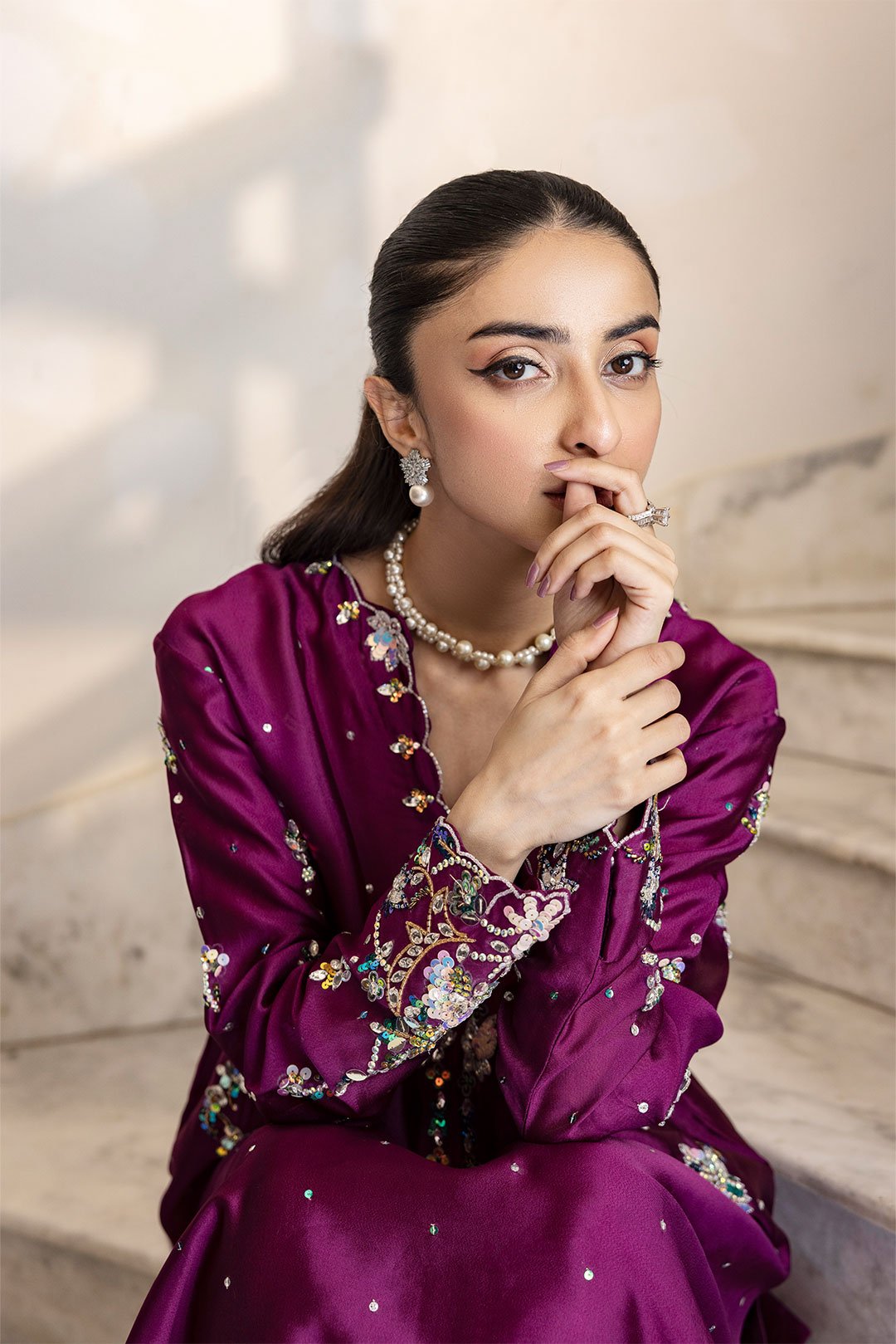 A richly adorned silk outfit, Magenta, is a celebration of timeless elegance. Designed in luxurious Shesha Silk, this exquisite ensemble captivates with its intricate hand-embellished details. The neckline, sleeves, and border glisten with colorful sequins and shimmering stones, creating a mesmerizing interplay of light and texture. Delicate floral motifs in the corner add an ethereal charm, making it a statement piece for intimate gatherings.