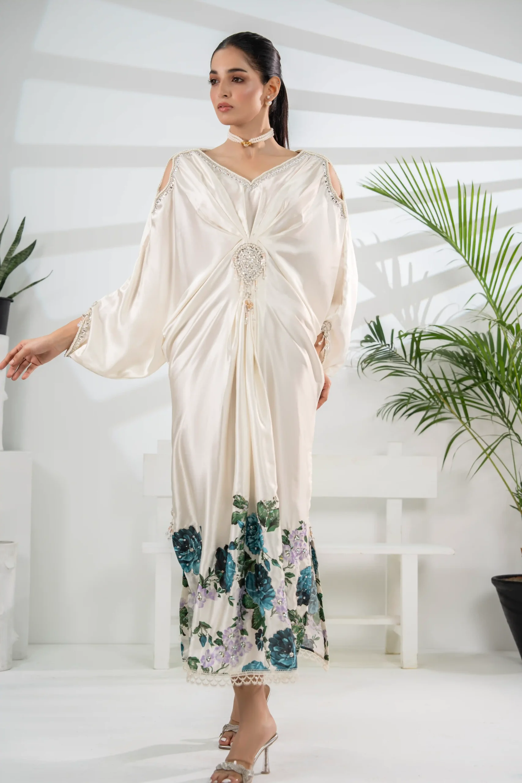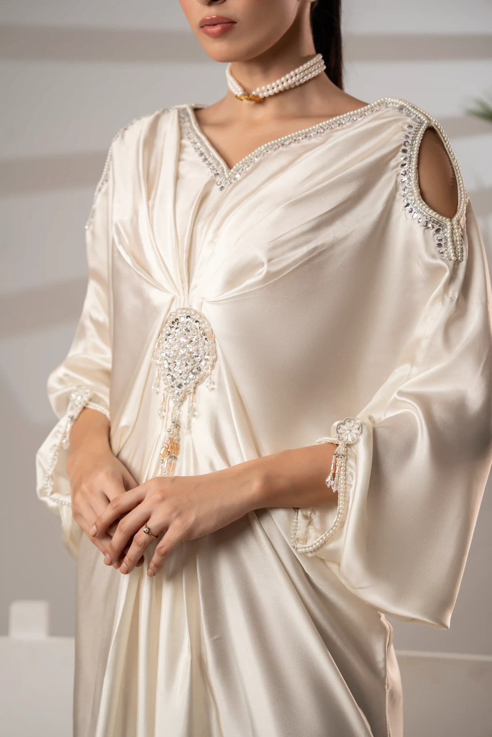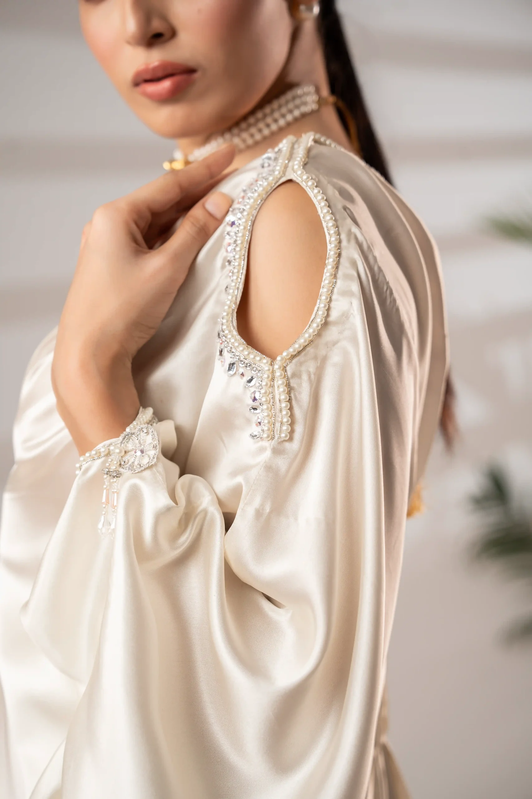 Sea Shell Ivory is where luxury blooms. Draped in luminous silk, it whispers sophistication through delicate embroidery in pastel blues and purples. The pearl-kissed neckline and sleeves shimmer with quiet opulence, while tassel accents at the sleeves and chalk dance with graceful charm. A front bunch adorned with pearl tassels and sheer cutwork shoulders completes the masterpiece, every detail a brushstroke of richness, weaving together elegance and timeless allure.