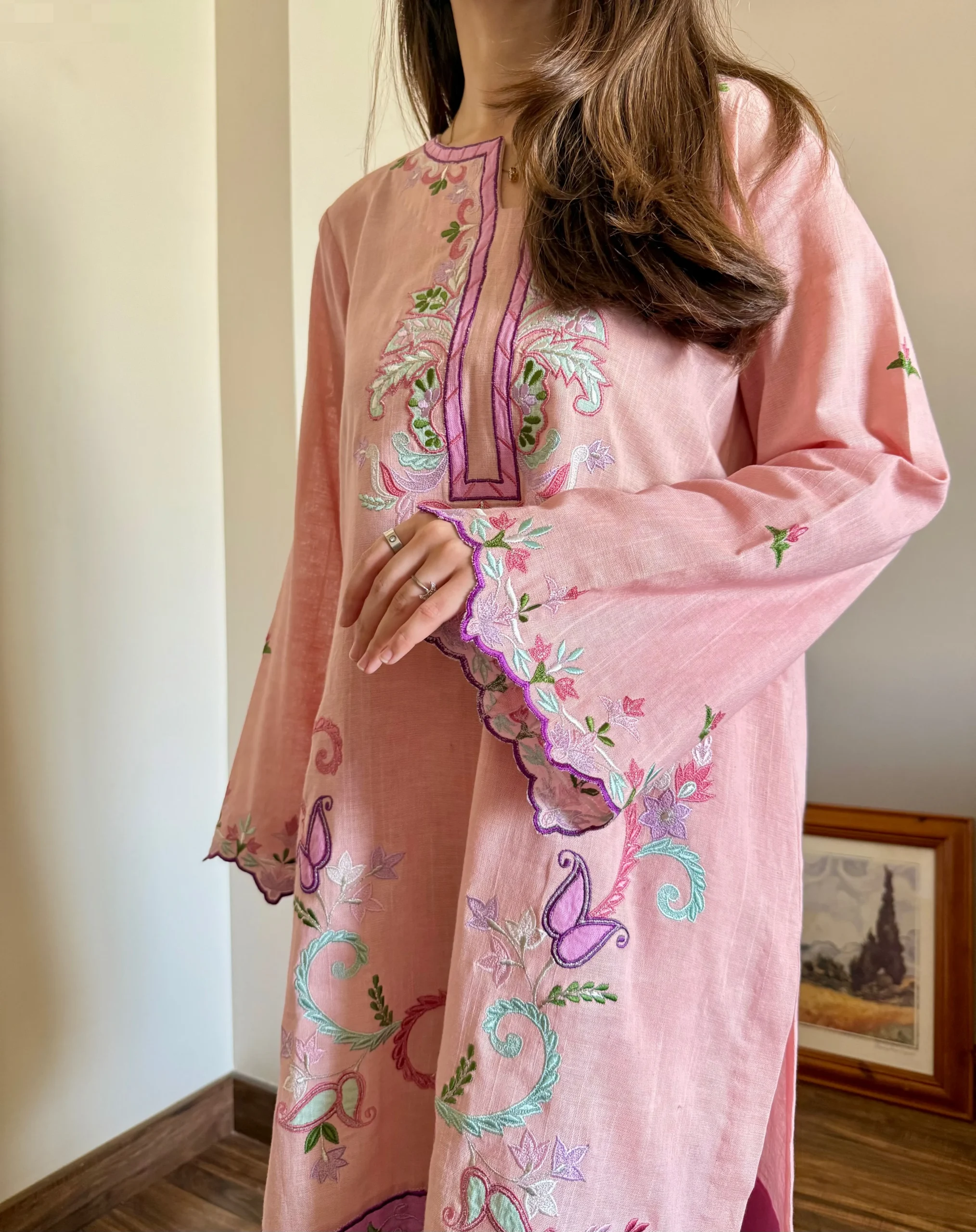 Introducing Crayola Peach Co-ord set crafted from luxurious Irish cotton fabric ,dyed in elegant peach shade adorned with beautiful machine embroidery all over the shirt elegantly complemented by contrast daman embroidery , Laid-back silhouette balanced by culottes with scalloped edges. Definitely adding a touch of elegance to your summer wardrobe.